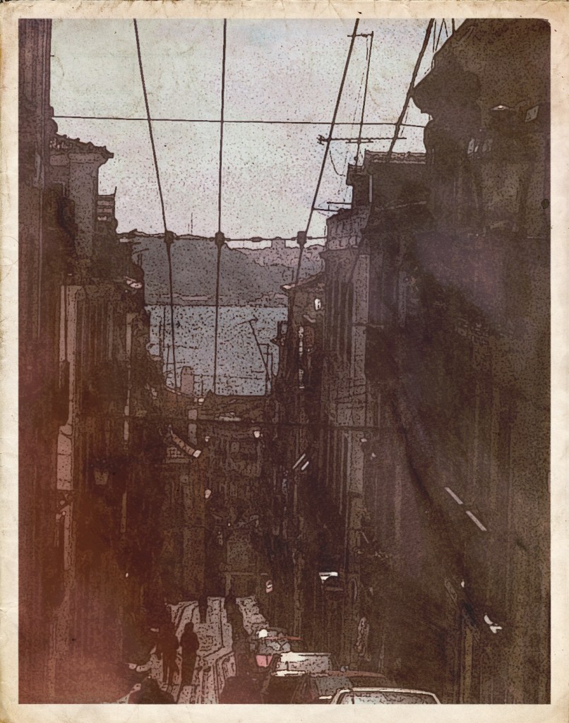 Enchevêtrement des toits et des pignons aux couleurs fanées, puits de lumière ornés de fer forgé et couvert de tôle ondulée, tuiles rouges et forêt d’antennes tordues. Le ciel est couvert, ce matin. Comme souvent dans les cités du bord de la mer, la nuit a tiré sur la ville la couverture des nuages, et ils peinent à se disperser au matin, mais on sent le soleil et la chaleur tout proches. Les bruits sont nouveaux, et pourtant familiers. Comme de vieux amis, ils montent vers moi de la rue, et entrent par la fenêtre largement ouverte. Les sirènes des ambulances, les voix des enfants, les frôlements des voitures sur les pavés de basalte de la chaussée, les oiseaux sur les toits, et dans les cages suspendues aux fenêtres. Cliquetis des boutiques, voisins s’interpellant à grand bruit, vendeurs ambulants. Au loin, le brouhaha emmêlé des autos, des camions et par-dessus ce tissu épais, les notes joyeuses des trams dégringolant les collines et les cris des goélands dans le ciel au-dessus.