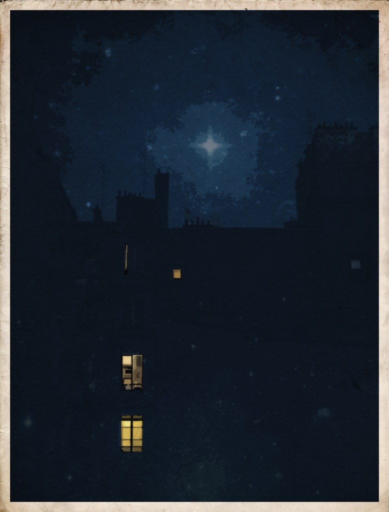 Tout à coup, une lucarne identique à la sienne s’alluma, en plein milieu du toit de l’immeuble d’en face… ce que l’on appelle un « chien assis » (en l’occurrence, il devait s’agir d’un caniche nain), pour rejoindre tous les autres vers luisants qui tapissaient la nuit.