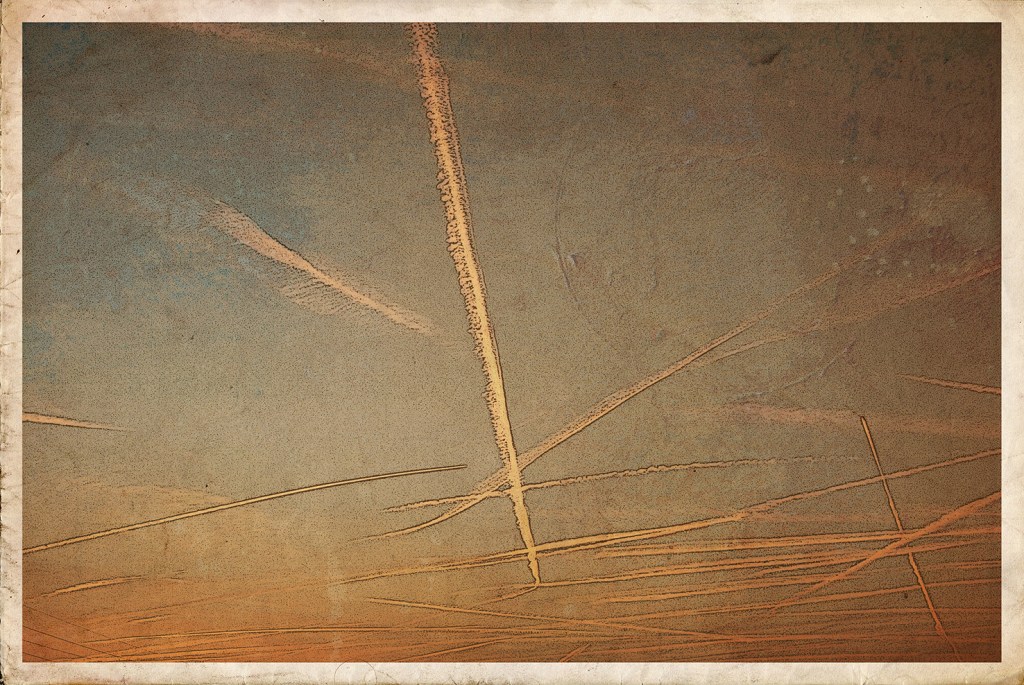 des griffures blanches, courtes et fines tracées par les plumes invisibles des avions