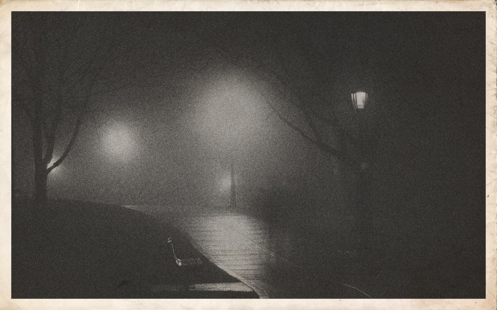 Ce soir, un parfum d’automne flottait… Les fumées des feux de bois domestiques remplissaient l’air humide d’âcres buées. Plus loin, enfoui dans les brumes comme dans une écharpe douillette, le clocher égrenait les heures. L’air piquait le nez, et les fenêtres étaient éclairées comme de paisibles reposoirs.